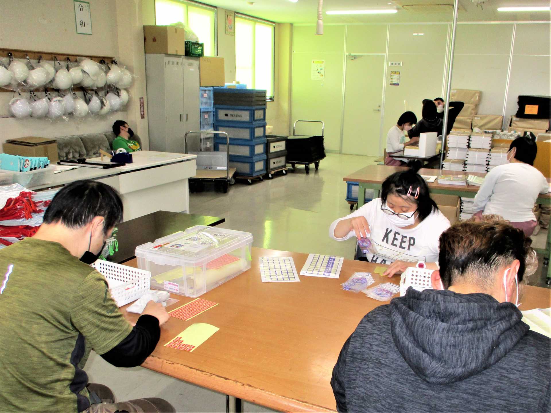 自動車の部品をはじめ、プリン容器やプラモデルのパーツなど種類は30種類を超えます。この作業を通じて、検品や梱包、仕上げ作業、伝票入力に至るまで、利用者さんは作業を分担しながら日々取り組んでいます。